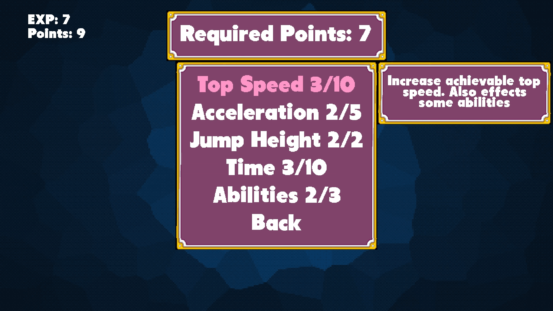 From the jump, your abilities start out incredibly limited, even down to the amount of time you have to traverse the level. But at the end of each run, the Charms you've collected are converted into EXP, and subsequently into Points you can spend on upgrading your attributes: Speed, Acceleration, Jump Height, Time, and "Abilities," the last of which adding to your moveset, granting you more options with which you can traverse the level and even access routes potentially inaccessible prior (Although depending on how you allocate your stats, those routes might already be possible to traverse based purely on your own skill)